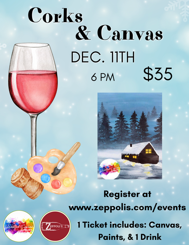 Zeppoli's presents the December Corks & Canvas with Creative Canvas of the New River Valley titled "Snowed in Cabin" on Thursday, December 11, 2025.