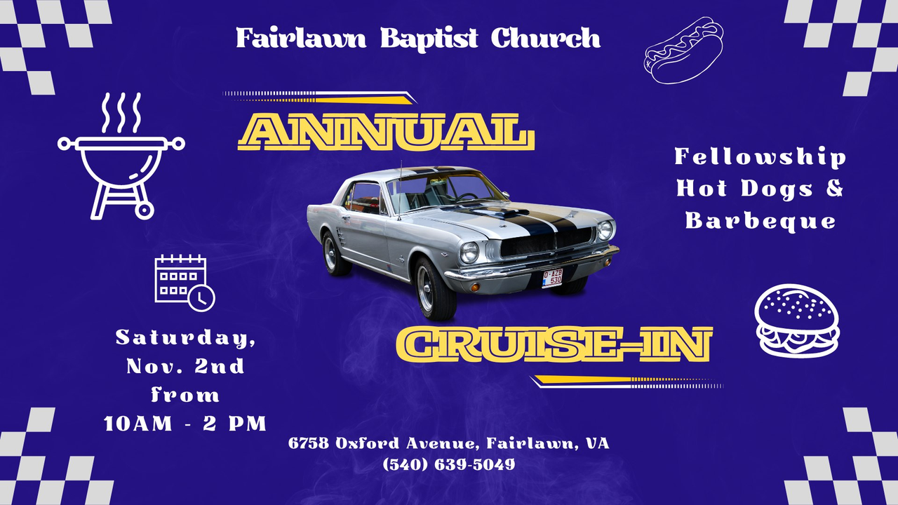 Fairlawn Baptist Church presents their Annual Cruise-In on Saturday, October 28, 2023.