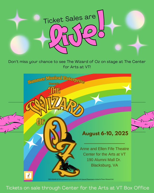 Summer Musical Enterprise presents "The Wizard Of Oz" with six performances at the Center for The Arts at Virginia Tech starting on Wednesday, August 6, 2025 and continuing through Sunday, August 10, 2025.