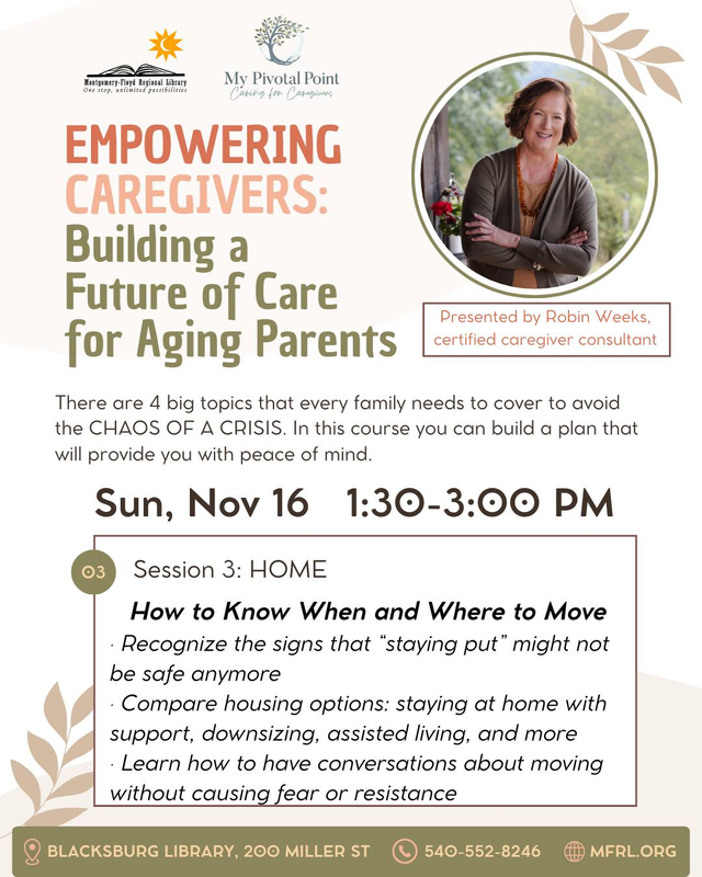 The Blacksburg Library presents the program and Session 3 of "Empowering Caregivers: Building a Future of Care for Aging Parents" with the topic "Home" on Sunday, November 16, 2025.