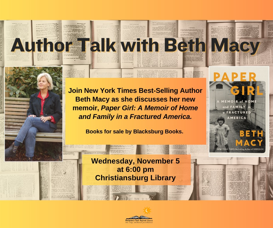 The Christiansburg Library presents Author Talk with Best Selling Author Beth Macy on Wednesday, November 5, 2025.