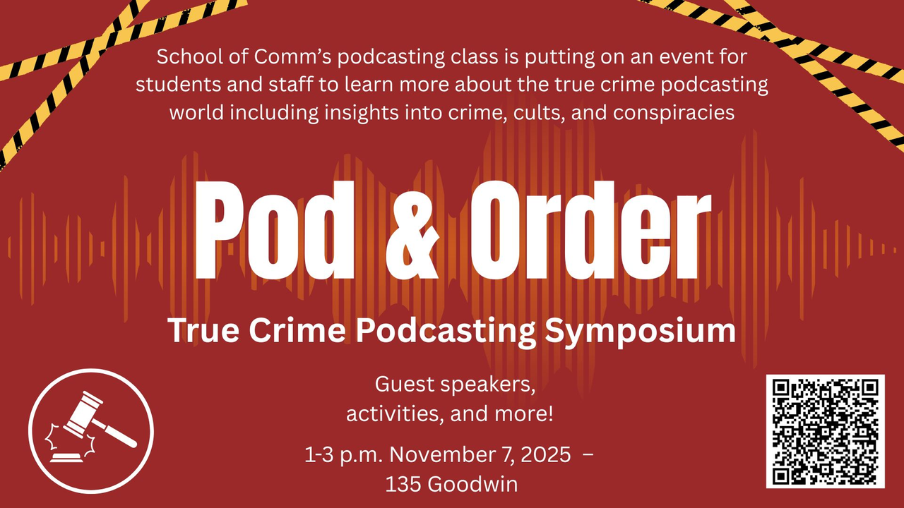 The School of Communication's podcasting class is putting on Pod & Order, a podcasting and true crime symposium, for students and staff to learn more about the true crime podcasting world including insights into crime, cults, and conspiracies. Enjoy a day of chilling tales, expert insights, and killer networking!
