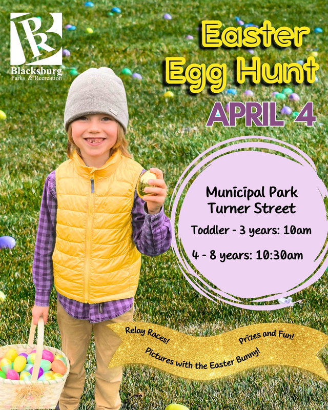 Blacksburg Parks and Recreation Department presents the Annual Blacksburg Easter Egg Event on Saturday, April 4, 2026 at Blacksburg Municipal Park (Caboose Park).