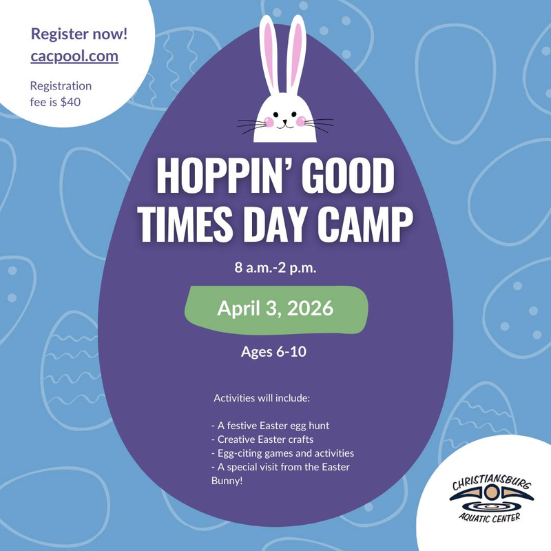 The Christiansburg Aquatic Center presents the Hoppin' Good Times Day Camp on Friday, April 3, 2026 from 8:00 AM until 2:00 PM with a registration deadline of Thursday, April 2, 2026 by 12:00 PM.