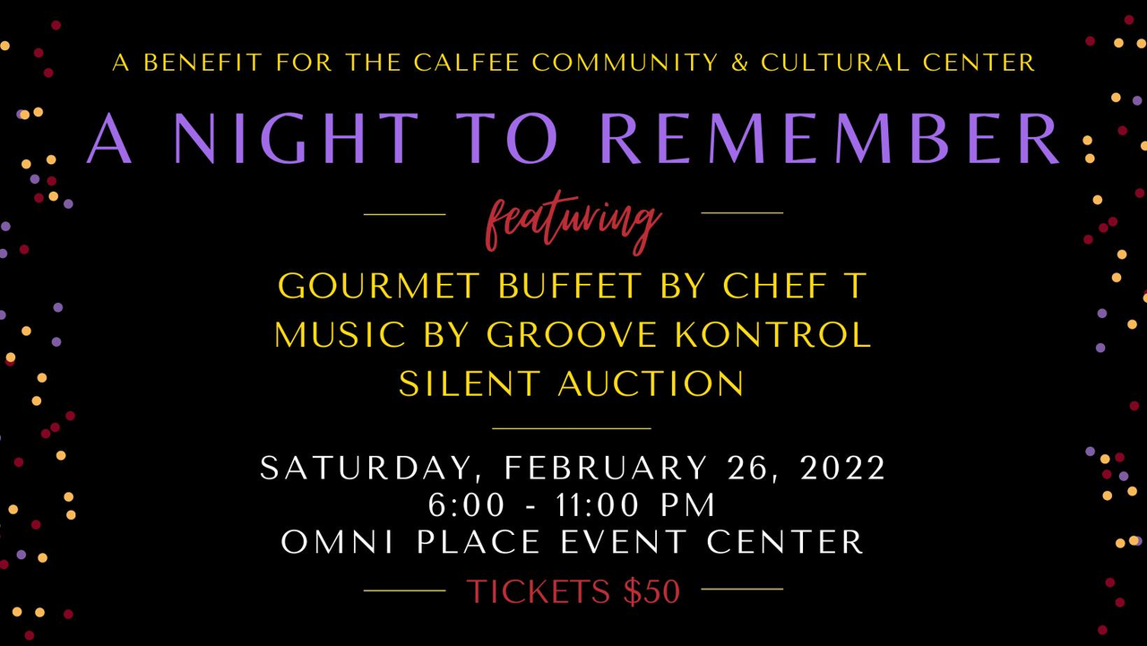 The Calfee Community & Cultural Center presents "A Night To Remember", a fundraising gala to benefit the Calfee Community & Cultural Center, on Saturday, February 26, 2022 at the Omni Place Event Center.