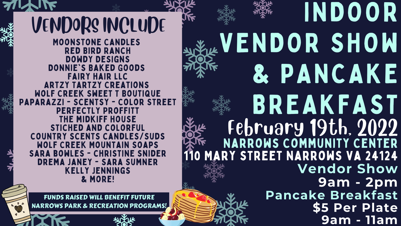 Narrows Parks and Recreation presents their Indoor Vendor Show & Pancake Breakfast on Saturday, February 19, 2022 at Narrows Community Center.