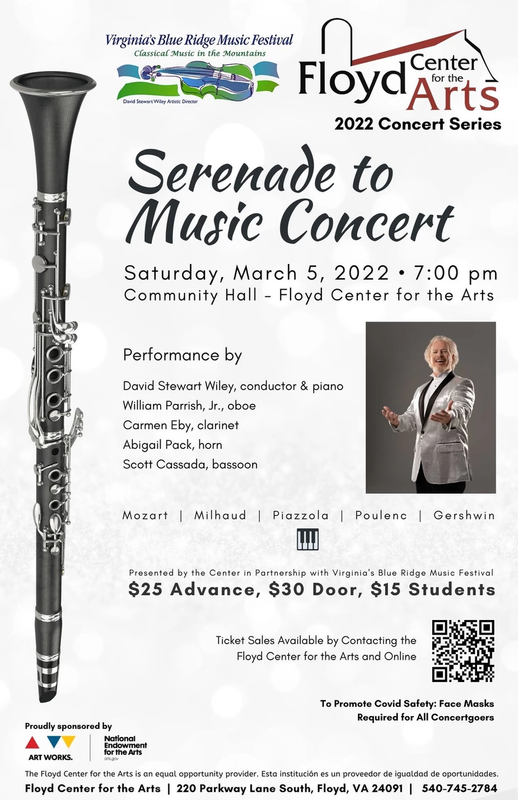 The Floyd Center for the Arts is honored to partner with the Virginia Blue Ridge Music Festival and Roanoke Symphony Orchestra to present this classical concert, Serenade to Music. This concert features compositions by Milhaud, Poulenc, Gershwin, and Mozart performed by David Stewart Wiley & members of the Roanoke Symphony Orchestra.