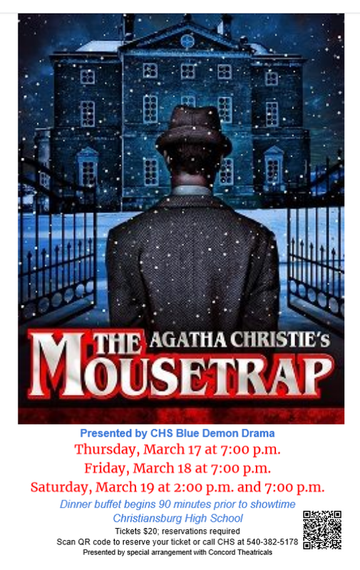 The Christiansburg High School Blue Demon Drama Department presents A Dinner Theater Experience with the classic murder mystery "The Mousetrap" with four performances starting on Thursday, March 17, 2022 through Saturday, March 19, 2022 at Christiansburg High School.