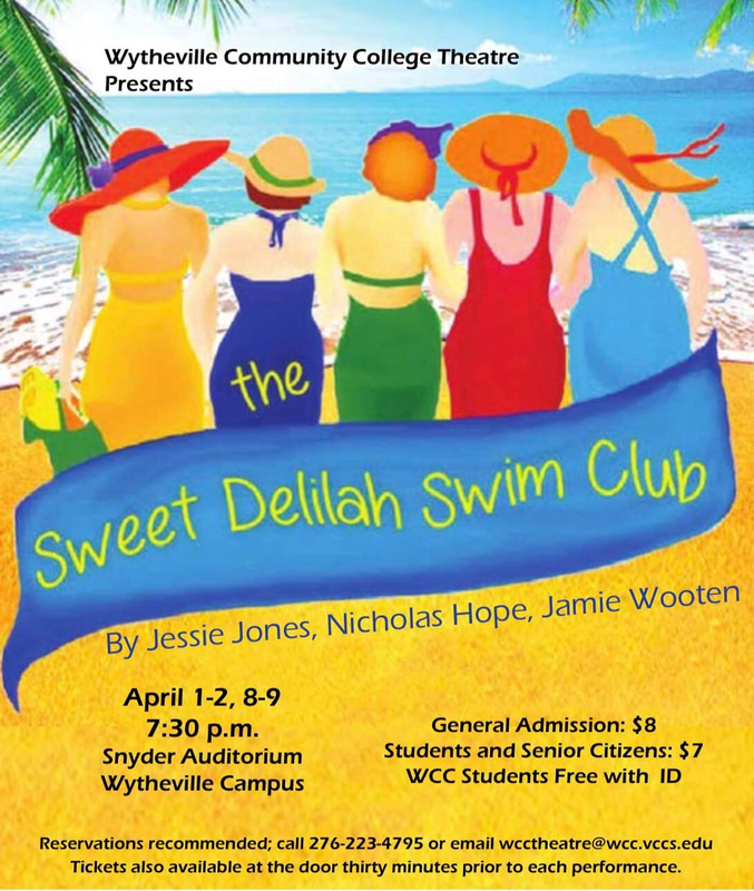 Wytheville Community College Theatre presents the play "The Sweet Delilah Swim Club" with four performances starting on Friday, April 1, 2022 through Saturday, April 9, 2022 in Snyder Auditorium located within Grayson Hall on the campus of Wytheville Community College.