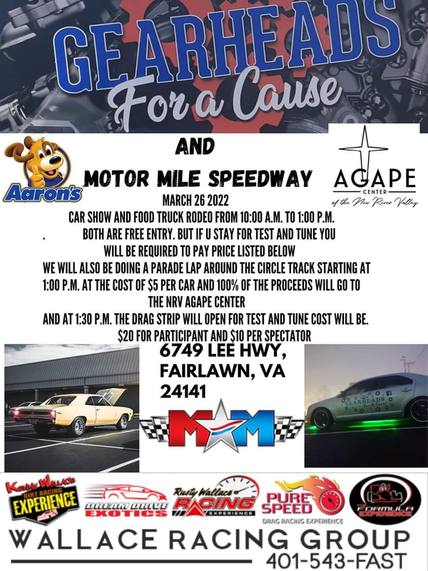 Gearheads For A Cause presents a Car, Truck & Bike Show for the Agape Center NRV on Saturday, March 26, 2022 at Motor Mile Speedway.