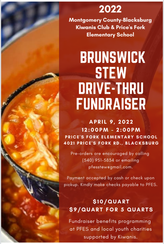 Price’s Fork Elementary School (PFES) and The Montgomery County-Blacksburg Kiwanis Club are holding their annual Drive-Thru Brunswick Stew Fundraiser on Saturday, April 9, 2022 at Prices Fork Elementary School in Blacksburg, VA.
