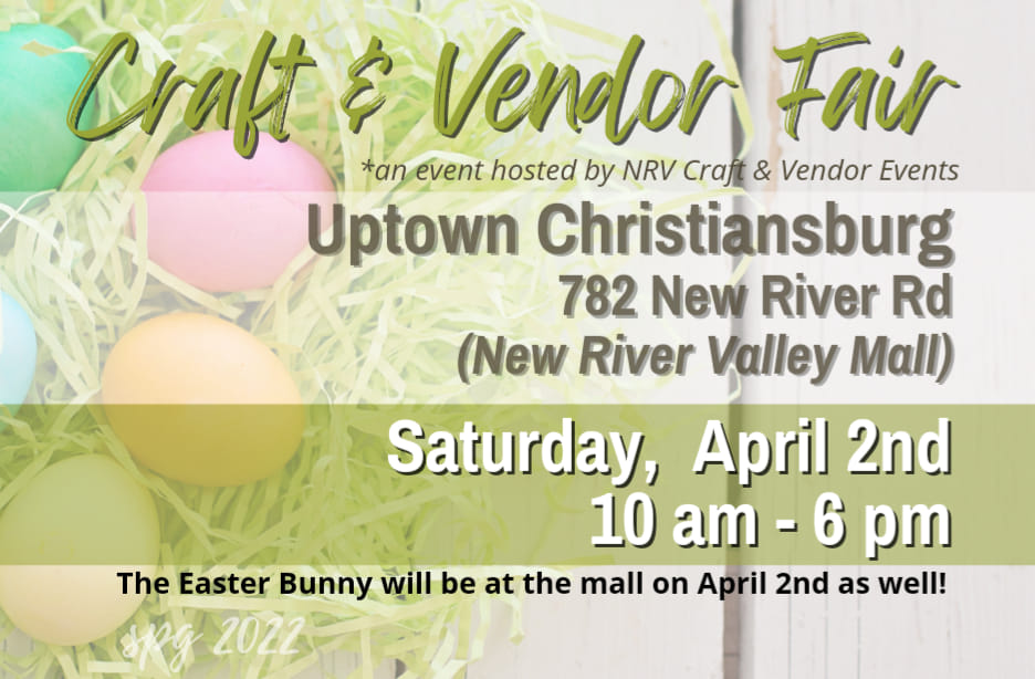 NRV Craft & Vendor Events hosts a Craft & Vendor Fair on Saturday, April 2, 2022 at Uptown Christiansburg (New River Valley Mall).