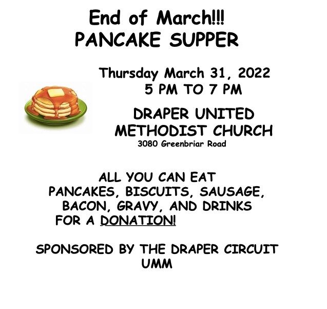Draper United Methodist Church presents their End of March Pancake Supper on Thursday, March 31, 2022.