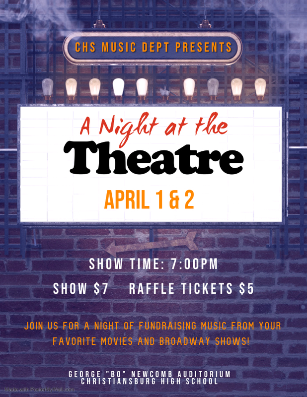 The Christiansburg High School Music Department presents the musical performance "A Night at the Theatre" on Friday, April 1, 2022 and Saturday, April 2, 2022 starting at 7:00 PM both nights inside the Christiansburg High School Auditorium.