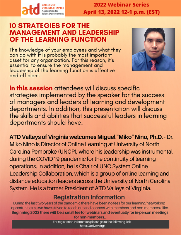 ATD Valleys of Virginia Chapter presents the online webinar "10 Strategies for the Management and Leadership of the Learning Function" on Zoom on Wednesday, April 13, 2022.