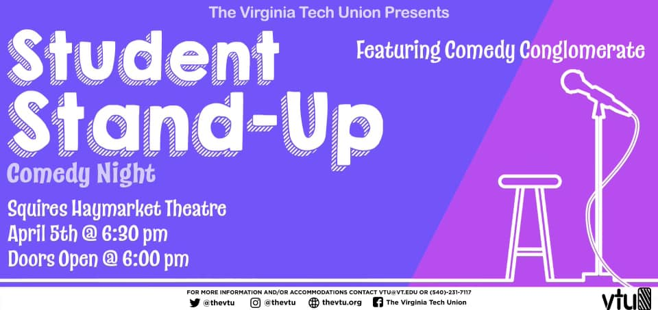 Virginia Tech Union presents Student Stand-Up featuring The Comedy Conglomerate on Tuesday, April 5, 2022 at Haymarket Theater inside the Squires Student Center on the campus of Virginia Tech.