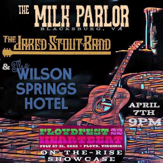 The Milk Parlor presents a FloydFest On-The-Rise Showcase featuring The Jared Stout Band and The Wilson Springs Hotel on Thursday, April 7, 2022.