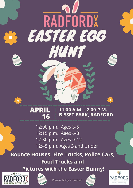 The City of Radford and the Radford Chamber of Commerce present the 2022 Radford Easter Egg Hunt on Saturday, April 16, 2022 at Bisset Park.