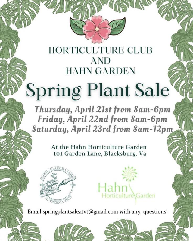 Our annual plant sale is back in full swing in 2022! Annuals, perennials, veggies, shrubs and trees will all be available. All sales will support activities at the Hahn Garden as well as the Horticulture Club at Virginia Tech.