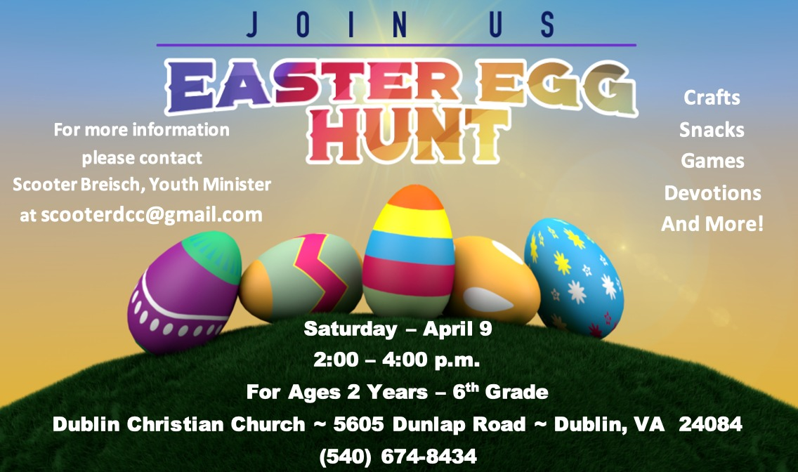 Join us for our Annual Dublin Christian Church Easter Egg Hunt for ages two years old to 6th grade. Enjoy crafts, snacks, games, devotions and more!
