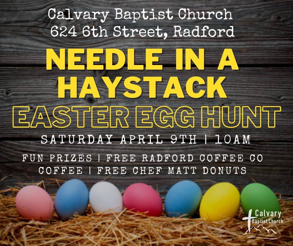 Calvary Baptist Church presents their 2022 Needle In A Haystack Easter Egg Hunt on Saturday, April 9, 2022.