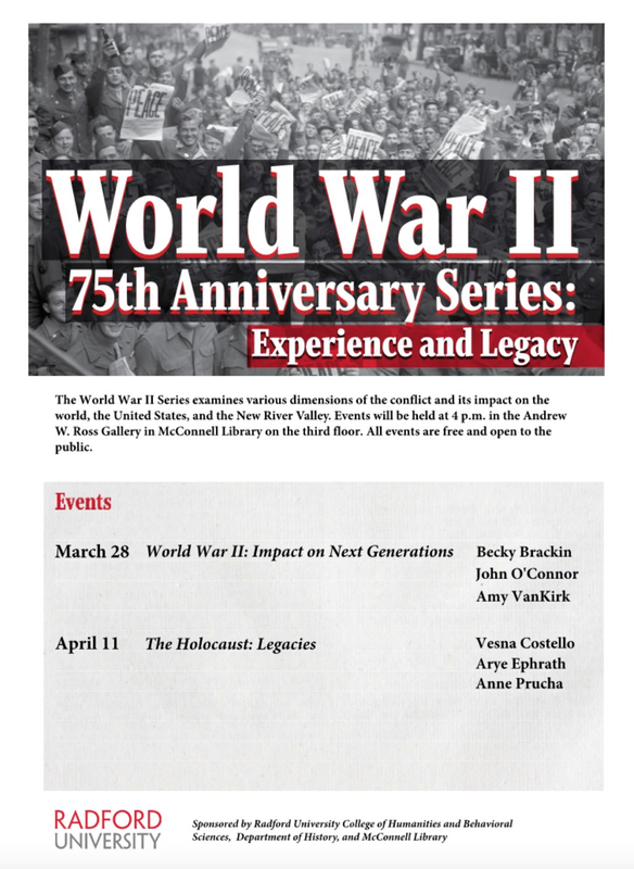 Radford University Department of History continues their World War II, 75 Years Since the Victory: The Holocaust, Legacies" on Monday, April 11, 2022 on Zoom and in person in the Ross Gallery inside the McConnell Library on the campus of Radford University.