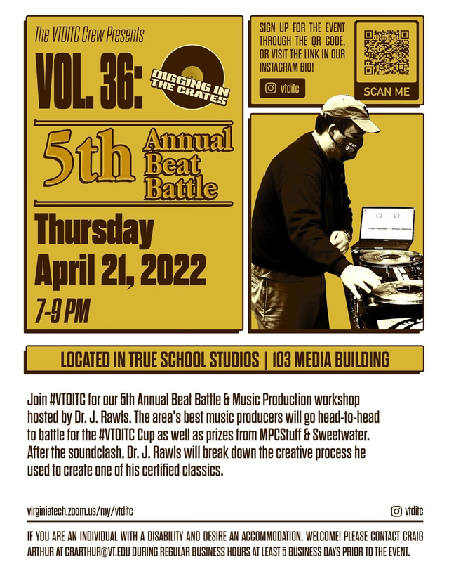 #VTDITC: Hip Hop Studies at Virginia Tech presents #VTDITC Vol. 36: the 5th Annual Beat Battle on Thursday, April 21, 2022 at the Virginia Tech Media Building on the campus of Virginia Tech.