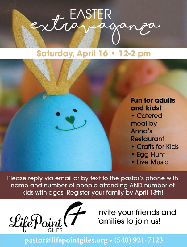 To register, please reply via email (pastor@lifepointgiles.org) or by text (540-921-7123) to the pastor’s phone with name and number of people attending and number of kids with ages. Please register your family by April 13th.