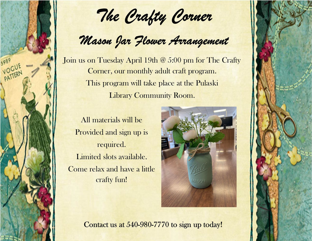 The Pulaski County Library presents the program "The Crafty Corner: Mason Jar Flower Arrangement" on Tuesday, April 19, 2022 in the Pulaski Library Community Room.
