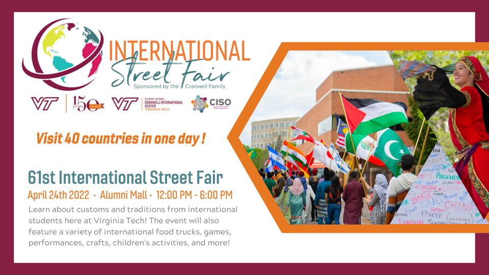 The International Street Fair is a social event where international and cultural student groups at Virginia Tech celebrate and share their traditions and heritage with the community of Blacksburg and the New River Valley.