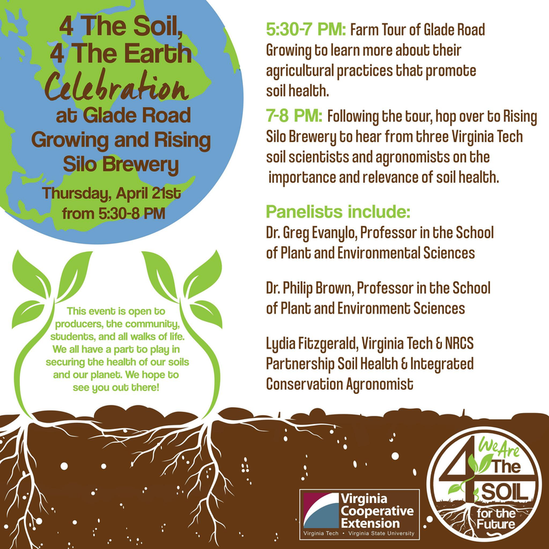 Then from 7:00-8:00 PM, there will be a panel conversation at Rising Silo Brewery discussing the importance and relevance of soil health featuring three Virginia Tech soil scientists and agronomists.