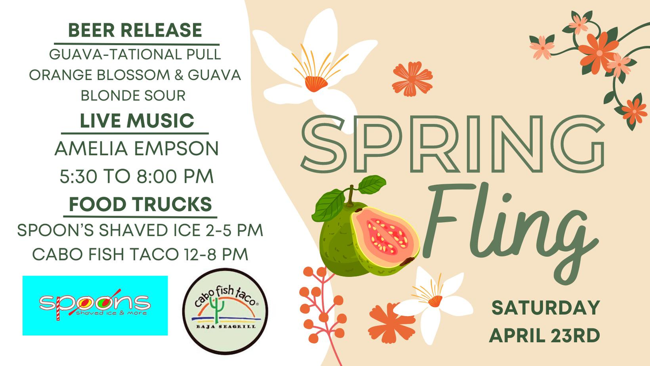 Dive into spring at Moon Hollow's Spring Fling! We are releasing a new edition of our Guava-tational Pull Blonde Ale. This time it is soured and has orange blossoms and guava puree added! Along with the beer release, we will have live music by Amelia Empson and delicious food by Cabo Fish Taco and Spoons Shaved Ice.