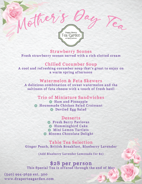 The Draper Blooms Tea Garden presents their 2022 Mother's Day Tea offered by reservation starting on Tuesday, May 3, 2022 through Tuesday, May 31, 2022, open Tuesday through Saturday.
