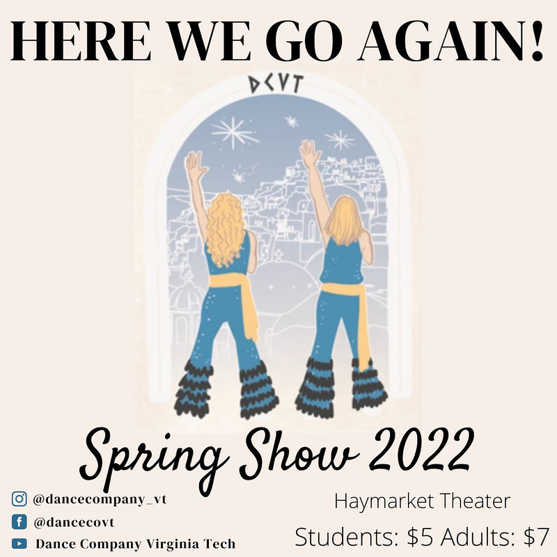Watch the lovely ladies of DCVT perform along with some special guest performances! We have worked hard on these dances all semester long and are excited to showcase them to the Virginia Tech Community.