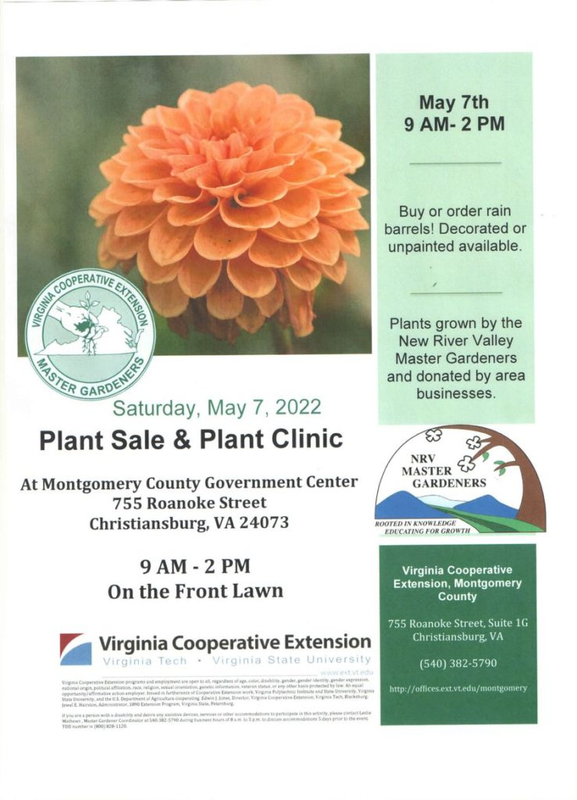 The New River Valley Master Gardner Association (NRVMGA) hosts their 2022 Spring Plant Sale on Saturday, May 7, 2022 on the front lawn of the Montgomery County Government Center in Christiansburg, VA.