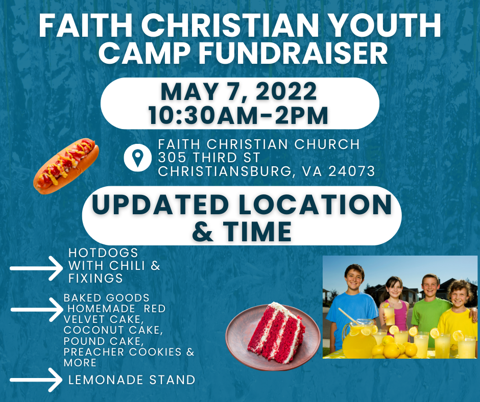 Faith Christian Church presents the Faith Christian Youth Camp Drive-Thru Fundraiser with Hot Dogs, Baked Goods & Lemonade Stand underneath the carport on Saturday, May 7, 2022.
