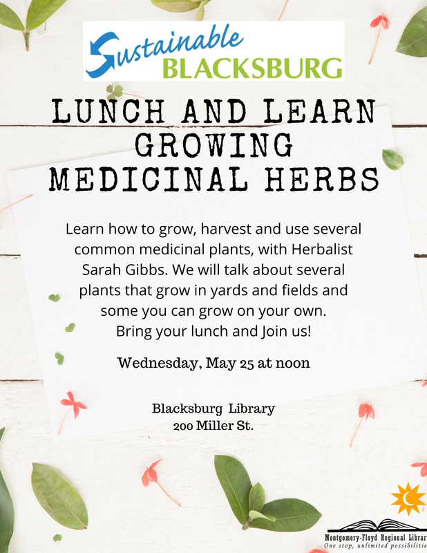 Blacksburg Library and Sustainable Blacksburg continue their Sustainable Blacksburg Lunch & Learn series with "Growing Medicinal Herbs" on Wednesday, May 25, 2022.