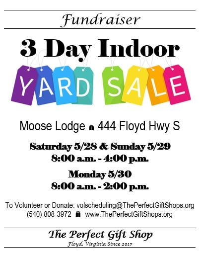 The Perfect Gift, Inc. presents its 2nd Annual Three-Day Indoor Yard Sale Fundraiser starting on Saturday, May 28, 2022 through Monday, June 30, 2022 at Floyd Moose Lodge 2300.