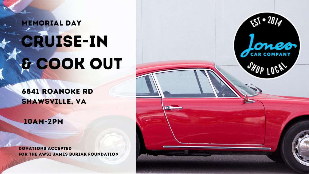 Jones Car Company presents a Memorial Day Cruise-In & Cook Out on Monday, May 30, 2022.