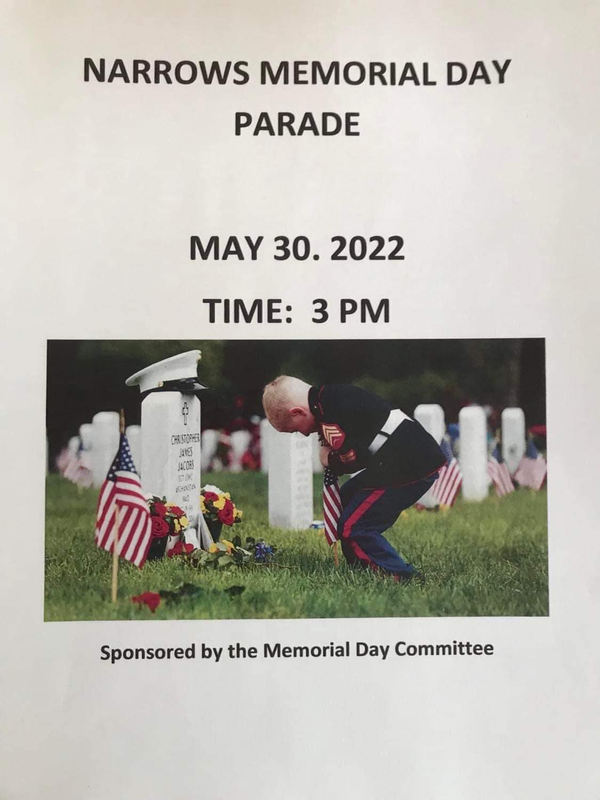 The Town of Narrows and the Narrows Memorial Day Committee present the Annual Narrows Memorial Day Parade on Monday, May 30, 2022 in downtown Narrows, VA based at the Veteran's Memorial Park.