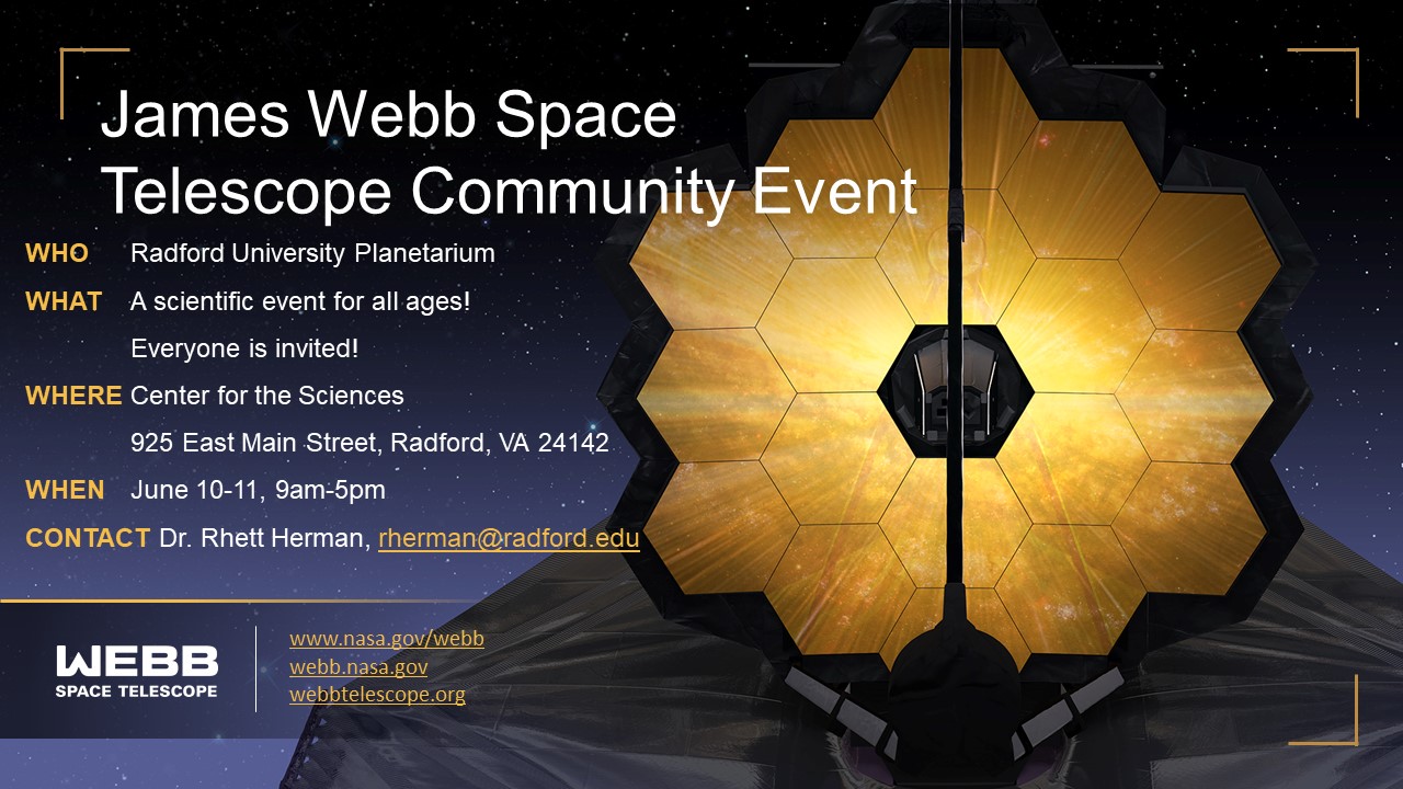 Radford University Planetarium presents a two-day James Webb Space Telescope Community Event on Friday, June 10, 2022 and Saturday, June 11, 2022.