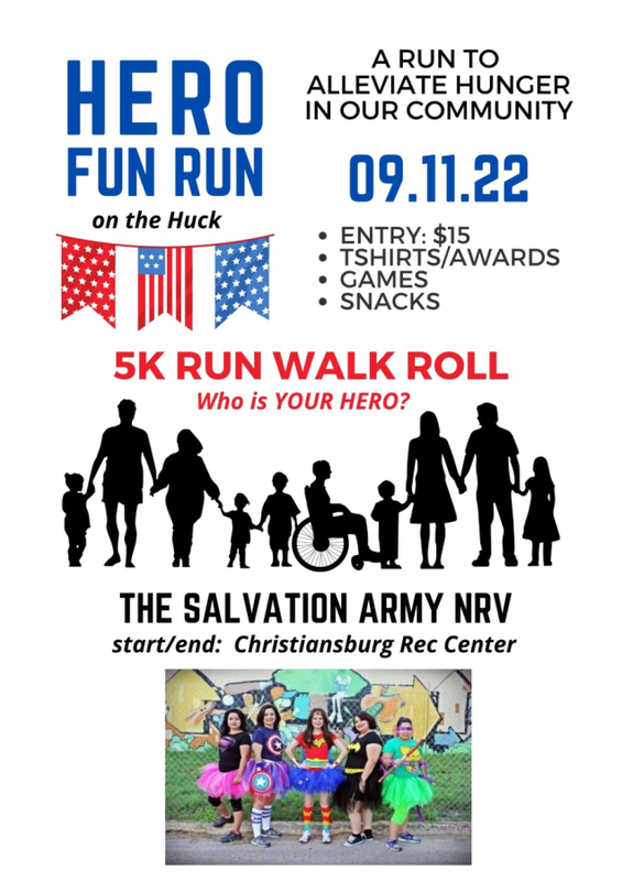 The Salvation Army presents the Hero Fun Run 5K Walk, Run & Roll benefiting food insecurity on Sunday, September 11, 2022 starting and ending at the Christiansburg Recreation Center and along the Huckleberry Trail.