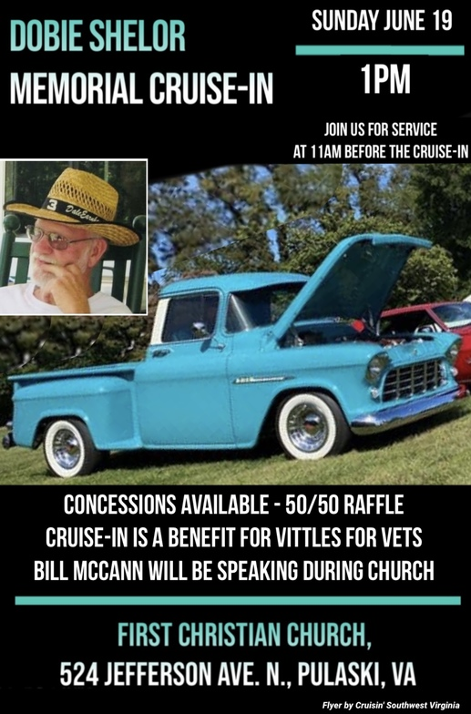First Christian Church of Pulaski presents the 2022 Dobie Shelor Memorial Cruise-In on Sunday, June 19, 2022.