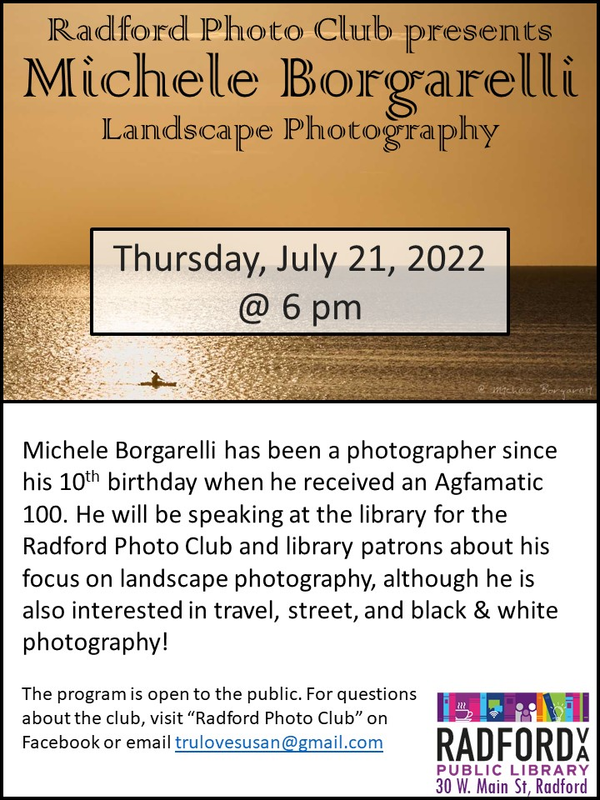 The Radford Photo Club presents their July program with the theme "Landscape Photography" with photographer Michele Borgarelli on Thursday, July 21, 2022 at the Radford Public Library.