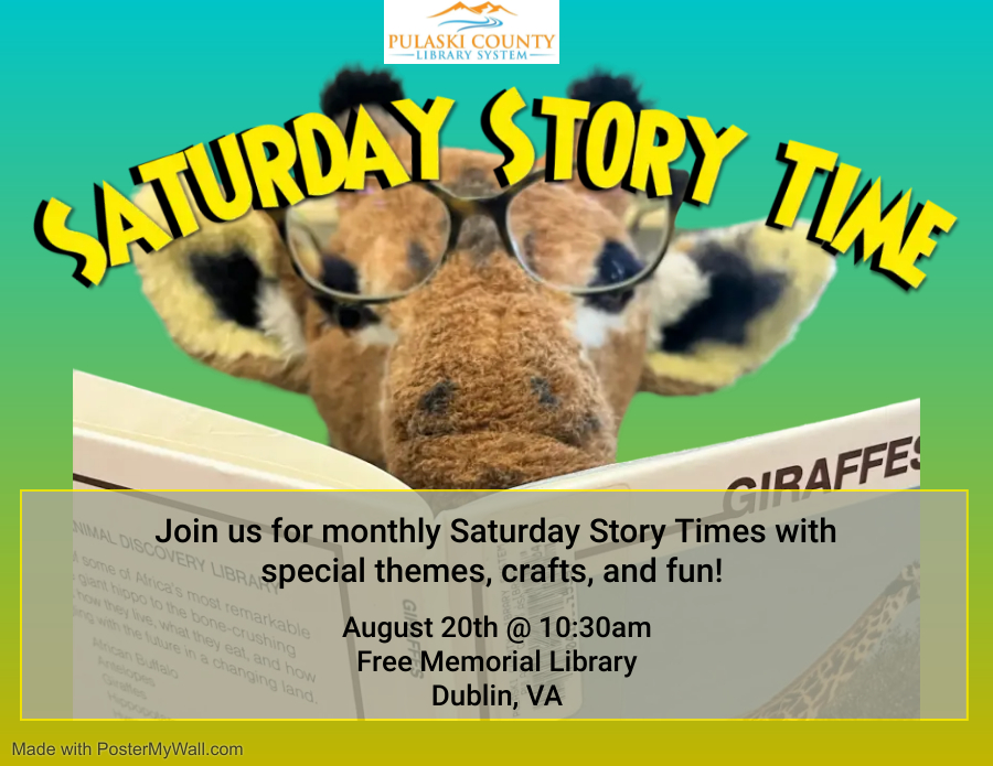 Dublin Library (Charles & Ona B Free Memorial Library) presents Saturday Story Time with Themes, Crafts and Fun on Saturday, August 20, 2022.