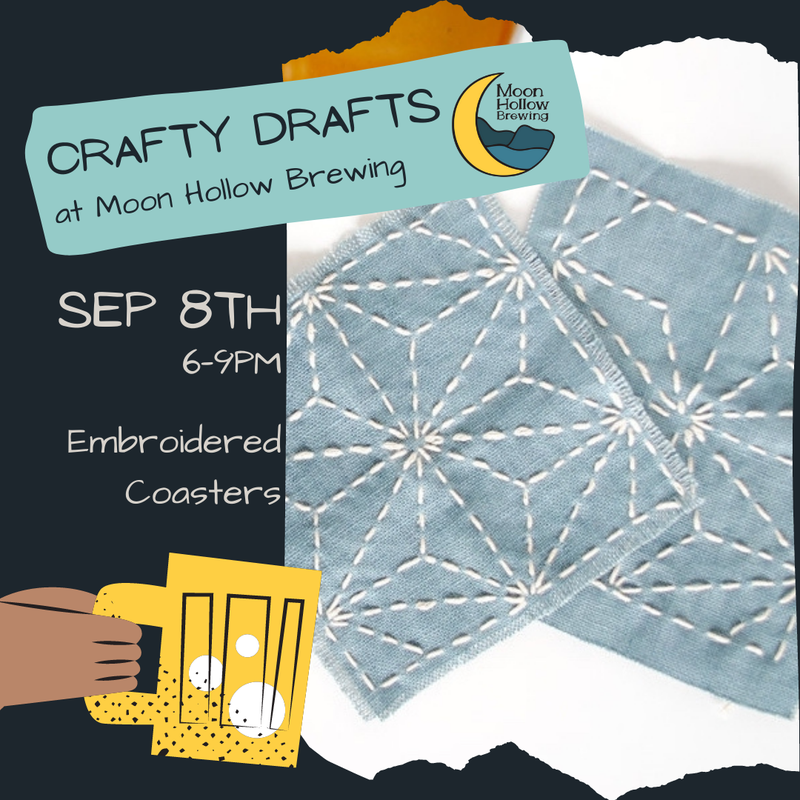 Moon Hollow Brewing presents Crafty Drafts featuring the craft "Embroidered Coasters" with New River Art & Fiber on Thursday, September 8, 2022.