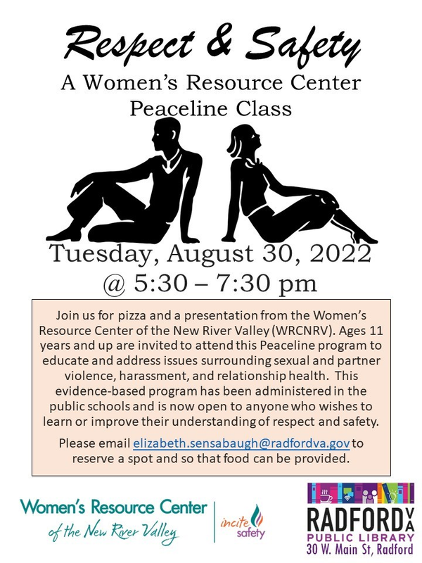 Radford Public Library and the Women's Resource Center of the New River Valley presents the program "Respect & Safety: A Women's Resource Center Peaceline Class" on Tuesday, August 30, 2022.