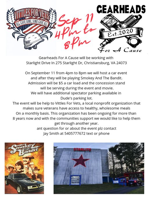 Gearheads For A Cause presents the event "Celebrate our Veterans at the Drive-In" on Saturday, September 11, 2022 at Starlight Drive-In in Christiansburg, VA.