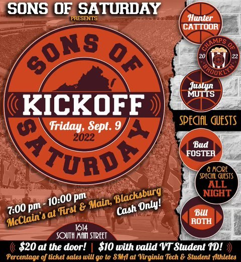 Sons of Saturday are back at McClain's with special guests Bud Foster, Bill Roth, Virginia Tech basketball players Justyn Mutts & Hunter Cattoor and more!