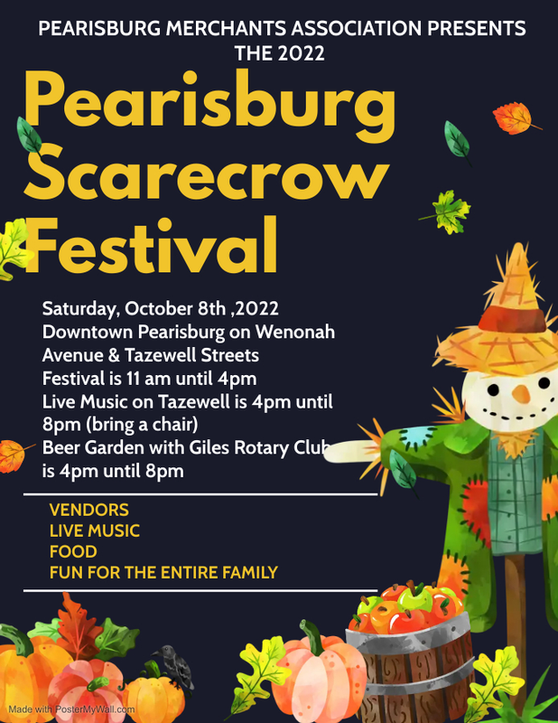 The Pearisburg Merchants Association presents the 7th Annual Pearisburg Scarecrow Festival on Saturday, October 8, 2022 on Wenonah Avenue and Tazewell Streets in downtown Pearisburg, VA.